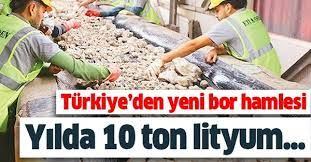 Son yıllarda bor madeninden uç ürün geliştirmeye yönelik çalışmalarını arttıran Türkiye, rafine bor üretimi sırasında ortaya çıkan lityumu geri kazanma üzerine bir teknoloji geliştirdi. Enerji ve Tabii Kaynaklar Bakanı Fatih Dönmez, "İlk etapta yıllık 10 ton lityum üretim kapasitesine sahip tesisi bu yıl devreye alacağız" dedi. YENİ BOR İŞLEME TESİSİ YOLDA GÜNEŞE 1.4 MİLYAR DOLARLIK YATIRIM ENERJİ ÜRETİMİNE GÜÇ KATACAK SIVI BORON SON ÇEYREKTE PİYASADA ALTIN ÜRETİMİ 45 TONU BULACAK