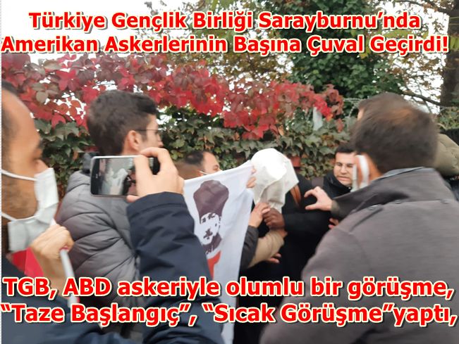 Türkiye Gençlik Birliği üyeleri Amerikan askerinin kafasına çuvalı geçirerek ABD’ye meydan okudu! Bu eylemi ABD’nin Türkiye’yi karıştırma ve kaos planlarına meydan okumak için yapan TGB üyeleri, Doğu Akdeniz’deki ABD tehditlerine ve 10 Büyükelçinin Türkiye’nin egemenlik haklarına saldıran bildirisine karşı Amerikan askerinin kafasına çuvalı geçirerek cevap verdi.