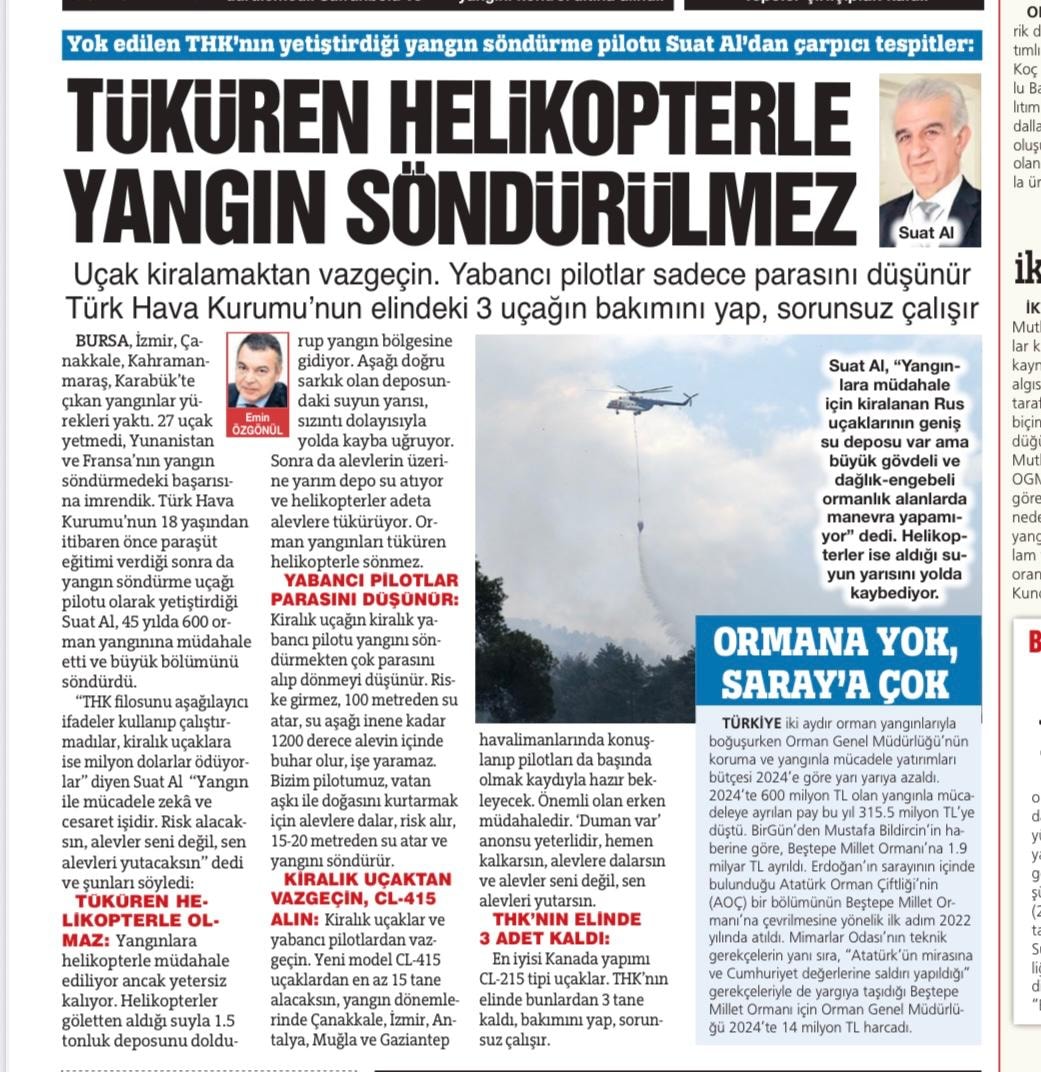Biz alevlerin üzerine 15-20 metreden su atar söndürürüz. Kiralık Rus uçağındaki pilot risk almaz, 100 metreden atınca su aşağı inene kadar 1200 derece alevin içinde buharlaşır. Bizim pilotlardaki vatan aşkı ile Rus pilotun mücadelesi bir olur mu ? Bugün Türk Hava Kurumunun elindeki CL-215 tipi Kanada yapımı uçaklar dünyanın da kullandığı en iyi yangın söndürme uçağıdır. Bakımını yapıp yıpranan parçalarını değiştirirsin, sorunsuz çalışır. İspanyolların getirdiği uçaklar da THK'nın elindekilerin aynısı... Rus kiralık uçakları büyüktür ve düz arazide daha başarılı olur, dağlık arazide zor manevra yapar. Ayrıca at sahibine göre kişner.