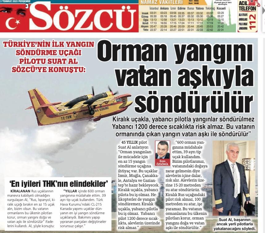 Türkiye’nin ilk yangın söndürme uçağı pilotu Suat Al geçirdiği trafik kazası sonucu yaşamını yitirdi. Suat Al, SÖZCÜ'ye yaptığı açıklamalarda orman yangınına müdahaleye ilişkin uyarılarda bulunmuştu. Al," Uçak kiralamaktan vazgeçin. Yabancı pilotlar sadece parasını düşünür. Türk Hava Kurumu'nun elindeki üç uçağın bakımını yap, sorunsuz çalışır" demişti.