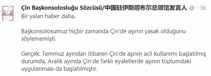 Amerikancılar Çin’in İstanbul Başkonsolosu Cui Wei’nin bir televizyon kanalında yaptığı açıklamaları kırparak, Çin'den Türkiye'ye gelen Sinovac aşılarının Çin'de yasaklı olduğu algısı yaratmaya çalıştılar.