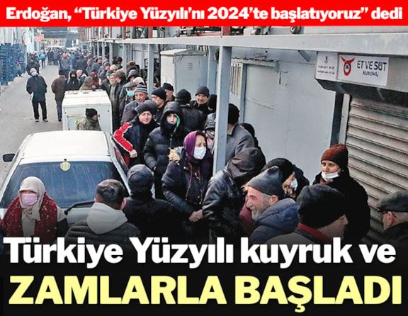 Derinleşen ekonomik kriz ile vatandaşın katlanan borç yüküne karşın, AKP iktidarı geçen yılki seçimlere “Türkiye’nin Yüzyılı olacak” sloganı ile girmişti. 2023’te Türkiye’nin Yüzyılı’nda vatandaşın payına uzayan kuyruklar ve hayat pahalılığı düştü. Vatandaşlar yılbaşı öncesi ucuz et alabilmek için karanlıkta saatlerce kuyrukta bekledi. Ankara’daki tarihi Ulus Hali’nde başlatılan yenileme çalışmalarının ardından yeniden faaliyete geçen Et ve Süt Kurumu (ESK) Ulus Satış Mağazası, ucuz et almak isteyen vatandaşlarının adeta akınına uğradı. Vatandaşlar yılbaşı öncesi saat 06.00’dan itibaren karanlığa ve soğuğa aldırış etmenden mağaza önünde beklemeye başladı, satış başlayana kadar 250 kişilik kuyruk oluştu.