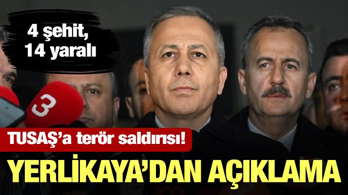 İçişleri Bakanı Ali Yerlikaya TUSAŞ’a geldi. Yerlikaya, "4 şehit, 14 yaralımız var. 3'ünün durumu ağır. 1'i kadın 1'i erkek olmak üzere 2 terörist etkisiz hale getirilmiştir. Teröristlerin kimlik tespit çalışmaları devam ediyor, kimlikleri belli olur olmaz hangi terör örgütü olduğunu paylaşacağız. TUSAŞ'a geçmiş olsun dileklerimi iletmek istiyorum" dedi.