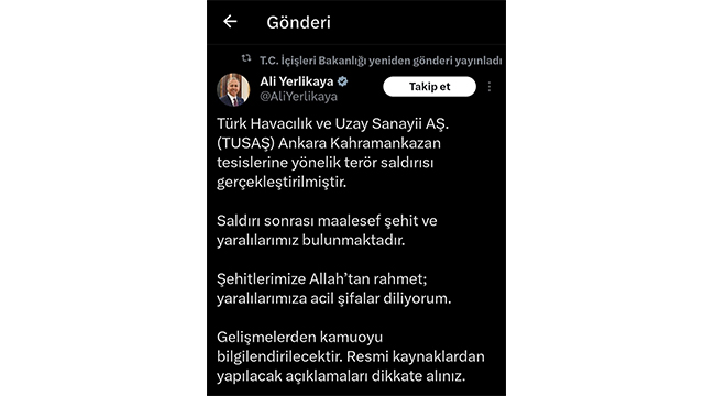 TUSAŞ'ın Ankara'nın Kahramankazan ilçesindeki tesislerinde patlama ve silah seslerinin duyulması üzerine bölgeye güvenlik güçleri, itfaiye ve sağlık ekibi sevk edildi.TUSAŞTürk Havacılık ve Uzay Sanayii A.Ş'nin, Havacılık Bulvarı Kahramankazan Ankara yerleşkesindeki giriş kapısındaki patlamanın ardından, silah sesleri duyuldu. Güvenlik nedeniyle personelin sığınaklara yönlendirildiği belirtildi.
