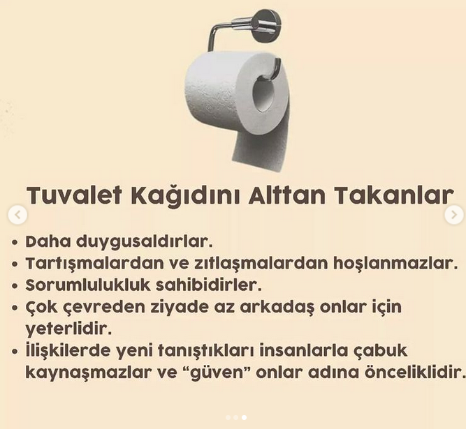 Tuvalet Kağıdını Alftan Takanlar • Daha duygusaldırlar. • Tartışmalardan ve zıtlaşmalardan hoşlanmazlar. • Sorumlulukluk sahibidirler. • Çok çevreden ziyade az arkadaş onlar için yeterlidir. • İlişkilerde yeni tanıştıkları insanlarla çabuk kaynaşmazlar ve "güven" onlar adına önceliklidir.