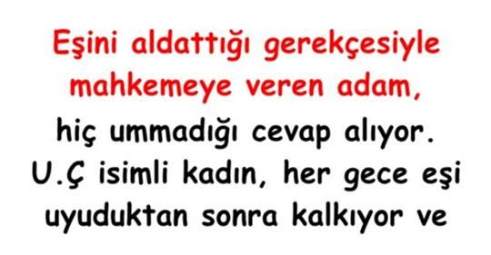 Evlilik Eşini aldattığı gerekçesiyle mahkemeye veren adam, hiç ummadığı cevap alıyor. U.Ç isimli kadın, her gece eşi uyuduktan sonra kalkıyor ve sesli olarak konuşuyor. Kocası eşinin bu durumunu fark ediyor ve her gece uyurmuş gibi yapıp , eşi kalktığında onun kiminle ve ne konuştuğunu anlamaya çalışıyor ve uyur numarası yapıp kadının konuşmalarını dinliyor. ‘’Eşim beni hiç umursamıyor. Akşama kadar onun yolunu 4 gözle bekliyorum, ama o her geldiğinde yorgunum, canım sıkkın diyerek, nasılsın sorularıma bile ters cevap veriyor.