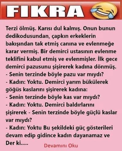 AYRINTILAR Y.ORUMDA����Terzi ölmüş. Karısı dul kalmış. Onun bunun dedikodusundan, çapkın erkeklerin bakışından tak etmiş canına ve evlenmeğe karar vermiş. Bir demirci ustasının evlenme teklifini kabul etmiş ve evlenmişler. İlk gece demirci pazusunu şişirerek kadına dönmüş. – Senin terzinde bu tür pazu var mıydı? – Kadın: Yoktu. Demirci yarım bükülerek göğüs kaslarını şişirerek kadına: – Senin terzinde bu tür kas var mıydı? – Kadın: Yoktu. Demirci baldırlarını şişirerek – Senin terzinde bu tür güçlü kaslar var mıydı? – Kadın: Yoktu Bu şekildeki güç gösterileri devam edip gidince kadın dayanamaz…