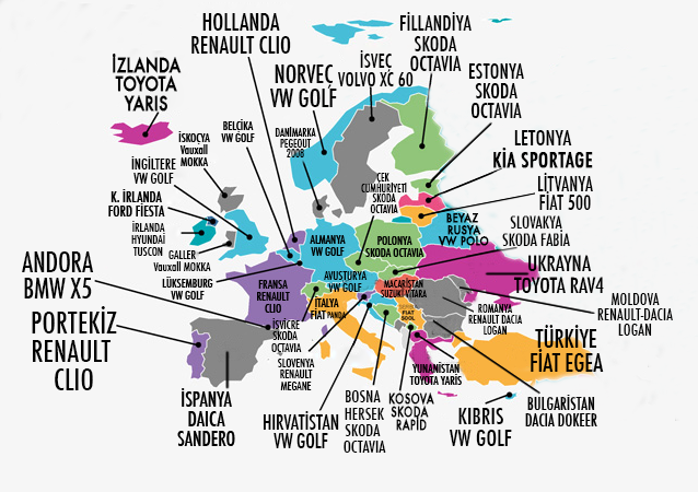 Avrupa kıtasında en çok satan model Volkswagen Golf. Skoda Octavia’nın performansı da görmezden gelinir gibi değil. ürkiye Fiat Egea ile listede ki Fiat’ın dünyadaki 4 liderliğinden birisi ülkemizde. BMW’nin zirvede olduğu tek ülke ise Andorra. Bu Fransa ve İspanya arasına sıkışmış küçük devlette vergi avantajının da etkisiyle BMW X5 modeli zirvede.