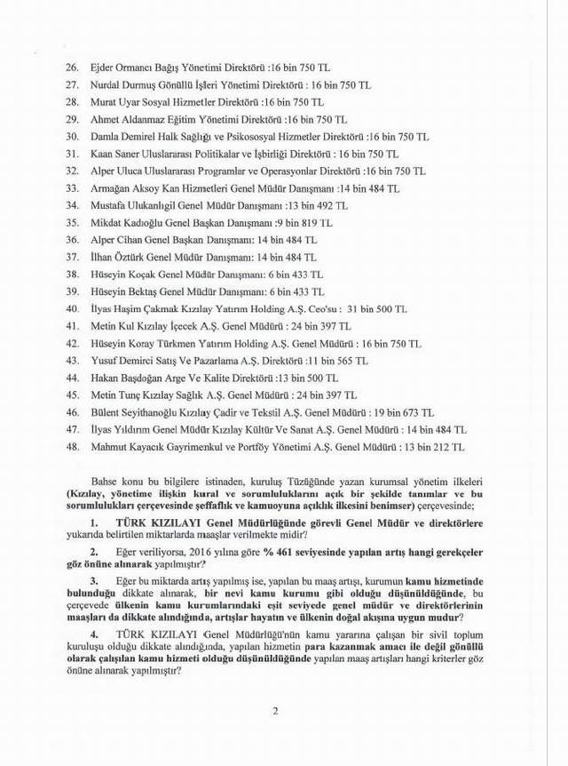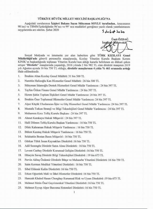 İYİ Partili Özdağ, Türk Kızılay'ı ile ilgili diğer önergesinde ise, Türk Kızılay'ında görevleri genel müdür ve direktörlerin maaşlarını TBMM gündemine taşıdı. Genel Müdür ve direktörlerin maaşlarında 2016 yılına göre yüzde 461 artış olduğuna dikkat çeken Özdağ, bu artışın hangi gerekçeler göz önüne alınarak yapıldığını sordu.