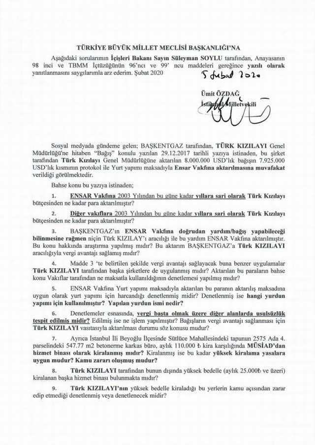 Özdağ, Ensar Vakfı'na ve diğer vakıflara 2003 yılından bugüne kadar Türk Kızılayı bütçesinden ne kadar para aktarıldığının yanında, Ensar Vakfı'na Kızılay aracılığıyla yapılan bağışın Başkentgaz'a vergi avantajı sağlayıp sağlamadığını da sordu.