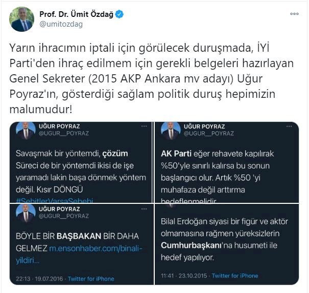 Özdağ paylaşımında “Yarın ihracımın iptali için görülecek duruşmada, İYİ Parti'den ihraç edilmem için gerekli belgeleri hazırlayan Genel Sekreter (2015 AKP Ankara mv adayı) Uğur Poyraz'ın, gösterdiği sağlam politik duruş hepimizin malumudur!” dedi.