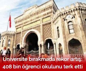 DW Türkçe'nin haberine göre, üniversite öğrenimini yarıda bırakan öğrencilerin sayısı 20172018 döneminde ise hızla arttı. Verilere göre 20172018 döneminde üniversiteyi bırakan öğrenci sayısı bir önceki yıla göre yüzde 92.2 artışla 408 bini aştı.
