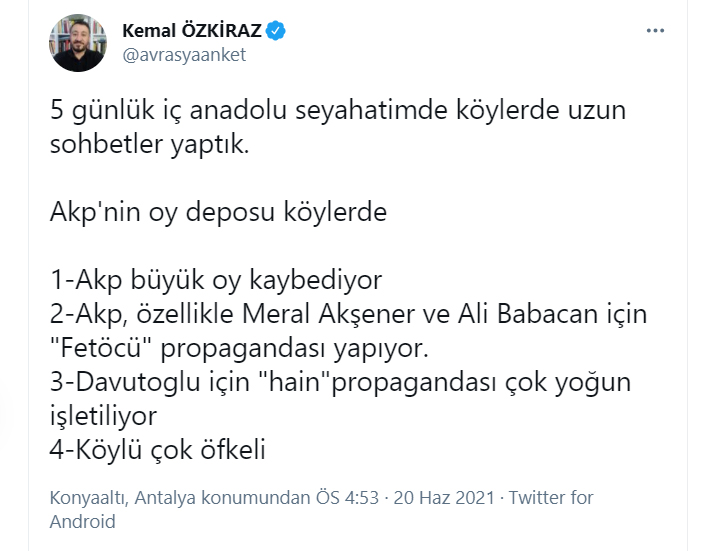 Avrasya Anketin sahibi araştırmacı Kemal Özkiraz İç Anadolu’da yaptığı 5 günlük gezinin ardından kritik değerlendirmelerde bulundu.