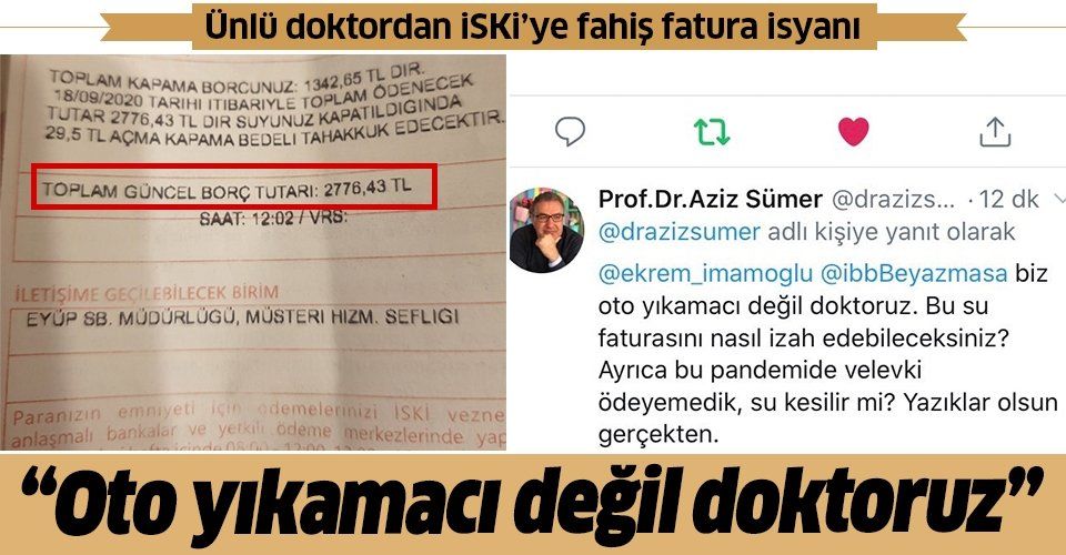 İstanbul Büyükşehir Belediyesi iştiraki İstanbul Su ve Kanalizasyon İdaresi'nin (İSKİ) fahiş fatura düzenlediği ortaya çıktı. Genel Cerrahi Uzmanı Prof. Dr. Aziz Sümer, kendisine 2776 TL su faturası geldiği ve suyunun kesildiğini açıkladı. Prof. Dr. Sümer, "Biz oto yıkamacı değil doktoruz. Bu su faturasını nasıl izah edeceksiniz? Bu rezalettir. Kimse kusura bakmasın. 2776 TL su faturası nedir?" diye sordu. Prof. Dr. Sümer, İSKİ'den gelen 2776 TL su faturasını da paylaştı. SÜMER: "KARI KOCA DOKTOR OLARAK HASTANEDEN GELDİK VE EVİMİZİN SUYU KESİLMİŞ" Kendisi ve eşinin doktor olduğunu hatırlatan Prof. Dr. Aziz Sümer; "Sayın Ekrem İmamoğlu ve İstanbul Büyükşehir Belediyesi Beyaz Masa; karı koca doktor olarak hastaneden geldik ve evimizin suyu kesilmiş. Çok teşekkür ederiz. Bu pandemi döneminizdeki duyarlılığından dolayı. Telefonumuz ve emailimiz var. İnsan bir ihtar etmez mi? Zaten yoğun çalışıyoruz ve unutuyoruz. 2776 TL su faturası.." ifadelerini kullandı. "BİZ OTO YIKAMACI DEĞİL DOKTORUZ. 2776 TL SU FATURASI NEDİR?" İSKİ 'Kıyas ile yazıyoruz' diyor. Pandemi döneminde sayaç okumaya gelmeyenlerin, su kesmeye gelmesi de ayrı bir ironi." Prof. Dr. Aziz Sümer; "Trollere malzeme vermeyin" şeklinde uyarıda bulunan bir kişiye, "Kimseye malzeme vermiyorum. Bu rezalettir. Kimse kusura bakmasın. 2776 TL su faturası nedir üstelik?" ifadelerini kullandı. İSKİ; 2776 TL SU FATURASINI NASIL DÜZENLEDİ?
