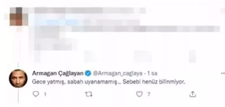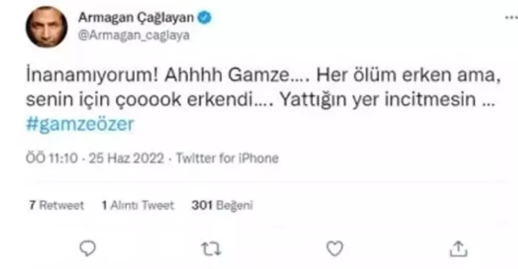 ARMAĞAN ÇAĞLAYAN ÜZÜNTÜSÜNÜ DİLE GETİRDİ Armağan Çağlayan, acı haberin ardından üzüntüsünü sosyal medya hesabından yaptığı paylaşımla dile getirdi: ''İnanamıyorum! Ahhhh Gamze…. Her ölüm erken ama, senin için çooook erkendi…. Yattığın yer incitmesin … #gamzeözer''Senaryosunu Yazdığı Film ve Diziler: Sihirli Annem (TV Dizisi 2021) Sihirli Annem Bir'iz (Sinema Filmi 2020) Hayatımın Rolü (TV Dizisi 2012) Maskeli Balo (TV Dizisi 2010) Nefes (TV Dizisi 2009) Hanımın Çiftliği (TV Dizisi 2009) Beni Unutma (TV Dizisi 2008) Nefes (Sinema Filmi 2007)