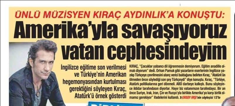 Ünlü sanatçı Kıraç’ın İngilizce eğitim ve Türkiye’nin Amerika’ya yönelik politikalarına ilişkin yaptığı açıklama tartışılıyor. Görüşlerini, başarılı müzisyenle konuştuk. Kıraç ‘Atatürk politikalarına geri dönüp Tam Bağımsız Türkiye’yi en önemli sloganımız yapmamız gerekiyor’ diyor. Yabancı dille eğitime de karşı çıkıyor. Sanatçının görüşlerini, Dilbilimci Kemal Ateş ve Köy Enstitülü usta yazar Osman Şahin’e sorduk.