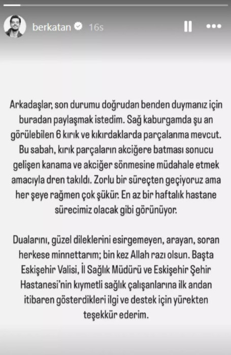 Bir süre hastanede kalan Berk Atan sağlık durumunu şöyle aktarmıştı: