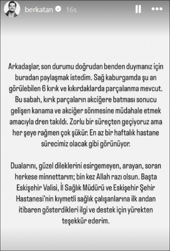 “Sağ kaburgamda şu an tespit edilebilen 6 adet kırık bulunuyor ve kıkırdak dokularımda da parçalanma meydana gelmiş. Bu sabah, kırık parçaların akciğere zarar verme riskine karşı, kanama ya da akciğer sönmesi gibi durumlara anında müdahale edilebilmesi için dren takıldı. Gerçekten zorlu bir süreçten geçiyorum ama buna rağmen hâlâ şükrediyorum. En az bir hafta daha hastanede kalmam gerekecek gibi görünüyor. Arayan, mesaj atan, dua eden herkese gönülden teşekkür ederim. Özellikle Eskişehir Valisi’ne, İl Sağlık Müdürü’ne ve Eskişehir Şehir Hastanesi’nde görevli tüm sağlık personeline ilk andan itibaren gösterdikleri ilgi için sonsuz minnettarım.”