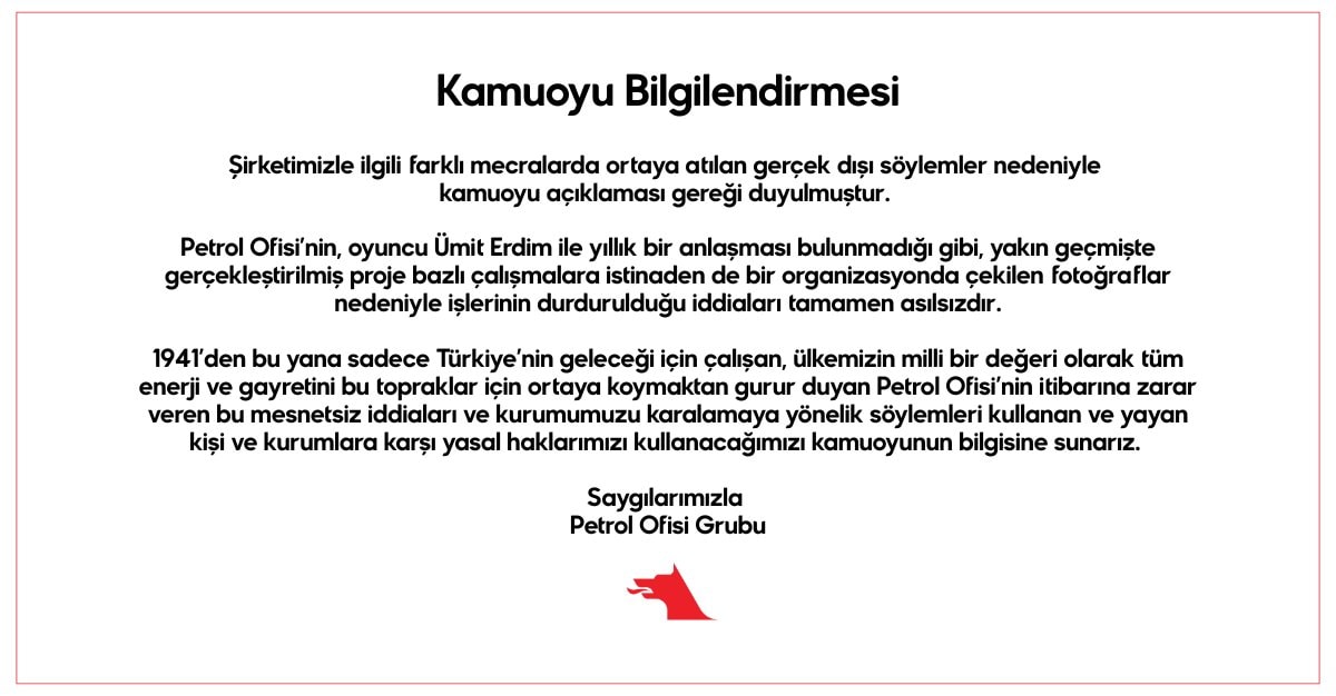 “Şirketimizle ilgili farklı mecralarda ortaya atılan gerçek dışı söylemler nedeniyle kamuoyu açıklaması gereği duyulmuştur. Petrol Ofisi’nin, oyuncu Ümit Erdim ile yıllık bir anlaşması bulunmadığı gibi, yakın geçmişte gerçekleştirilen proje bazlı iş birliklerinin bir organizasyonda çekilen fotoğraflar nedeniyle durdurulduğu iddiası da tamamen asılsızdır. 1941’den bu yana Türkiye için çalışan milli bir değer olarak itibarımıza zarar veren mesnetsiz iddiaları yayan kişi ve kurumlara karşı yasal haklarımız kullanılacaktır.”
