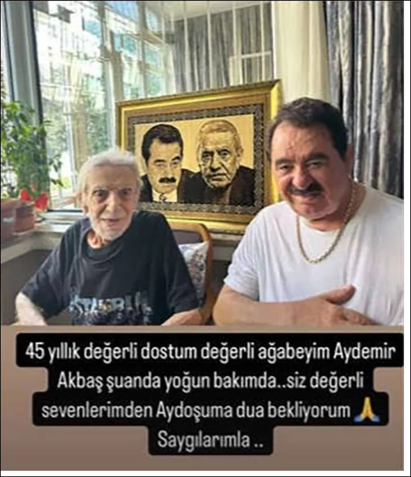 İbrahim Tatlıses, sosyal medya hesabından yoğun bakımda tedavisi süren Akbaş ile ilgili bir açıklama yaptı. Tatlıses, “45 yıllık değerli dostum, değerli ağabeyim Aydemir Akbaş, şu anda yoğun bakımda. Siz değerli sevenlerimden dua bekliyorum. Saygılarımla” ifadelerini kullandı.Yeşilçam’ın efsane isimlerinden olan ve uzun süredir kanserle mücadele eden Aydemir Akbaş, evinde baygın bulunduktan sonra hastaneye kaldırıldı. 88 yaşındaki oyuncudan gelen kötü haberi İbrahim Tatlıses sosyal medya üzerinden duyurdu. Tatlıses, Akbaş’ın sevenlerinden dua beklediğini söyledi.