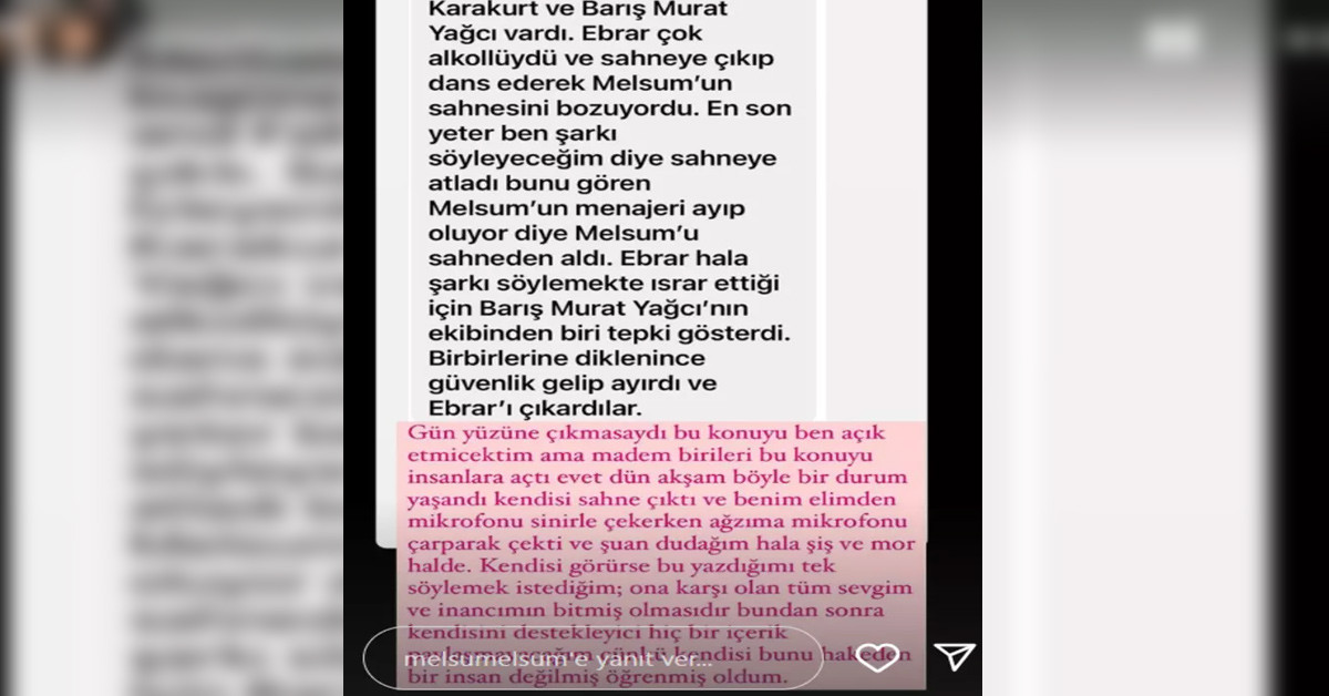 Olaya müdahale eden güvenlik görevlileri ise Ebrar Karakurt’u yaka paça mekandan dışarı çıkardı. Melsum Erdost, sosyal medya hesabından bir paylaşım yaparak olayı doğruladı. İşte o açıklama...