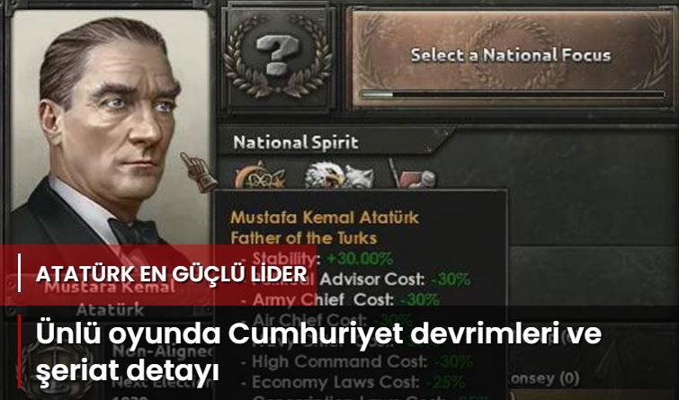 Oyunda, 1938’a kadar Türkiye’yi yöneten Mustafa Kemal Atatürk’e ait profilin sahip olduğu bonuslar dikkat çekiyor. Oyunda “Türklerin Babası” unvanıyla anılan Atatürk, yüzde 30 istikrar bonusunun yanı sıra, siyasi danışman masrafı ile Genelkurmay Başkanı ve kuvvet komutanları masrafında eksi yüzde 30 bonusa sahip olacak. Lider profili ayrıca ekonomi ve zorunlu askerlik kurallarının uygulanmasında da eksi yüzde 25 bonusa sahip olacak. Profilin tek dezavantajı ise 1939’da oyundan çıkması.