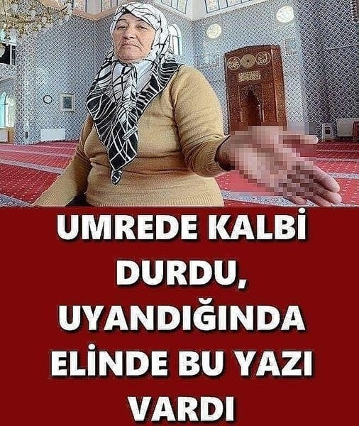 Umrede kalbi durdu uyandığında elinde bu yazı vardı! Görünce ş-ok olacaksınız!..Umrede ikindi namazını kılarken birden nefesinin kesildiğini ve ardından Allah’ın kendisine öbür tarafı gösterdiğini iddia eden Aynur Eken elinde bu yazı ortaya çıktı..İ’şte o gö’rüntüler…..Ayrıntılar Haberin Detayındadır…HABERİN DEVAMINI OKUMAK İÇİN GÖRSELE DO/KUNUNUZ