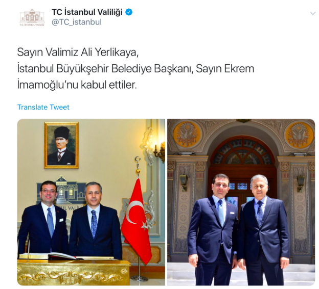 İBB Başkanı İmamoğlu’nun ziyaretiyle ilgili İstanbul Valiliği hesabından yapılan paylaşımda, Atatürk portresinde kaşları birleştirildi. Hesaptan yapılan ilk paylaşımda, İmamoğlu ve Yerlikaya’nın önünde durduğu portrede, Atatürk’ün kaşlarının montajla birleştirildiği görüldü.