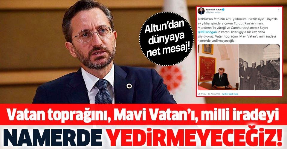 Altun mesajında,"Trablus'un fethinin 469. yıl dönümü vesilesiyle, Libya'da ay yıldızı göndere çeken Turgut Reis'in imanı, Menderes'in yüreği ve Cumhurbaşkanımız Sayın Recep Tayyip Erdoğan'ın kararlı liderliğiyle bir kez daha söylüyoruz: Vatan toprağını, Mavi Vatan'ı, milli iradeyi namerde yedirmeyeceğiz!" ifadelerine yer verdi.