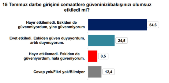 Araştırmaya göre "15 Temmuz darbe girişimi cemaatlere güveniniz/bakışınızı olumsuz etkiledimi?" sorusuna "Hayır etkilemedi, eskiden de güvenmiyordum, şimdi de güvenmiyorum" diyenlerin oranı yüzde 54,6, "Evet etkiledi, artık güven duymuyorum" diyenlerin oranı yüzde 24,5, "Hayır etkilemedi, hala güveniyorum" diyenlerin oranı ise yüzde 8,5 oldu.
