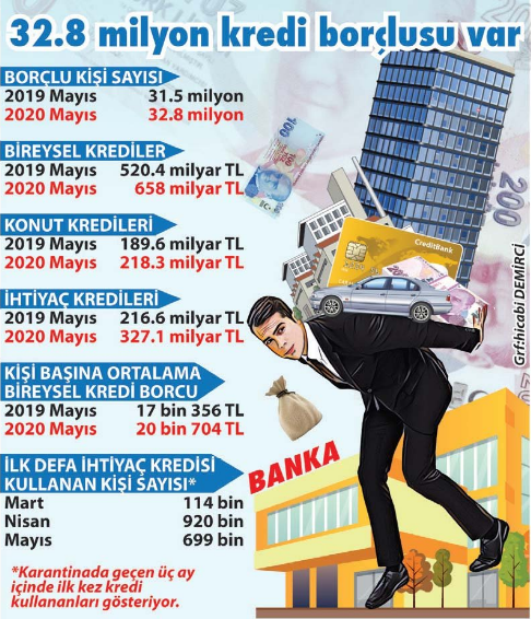 Türkiye Bankalar Birliği (TBB) Risk Merkezi'nin aylık raporu bu aramaların hiç de boşa çıkmadığını gösterdi. Nisanda ilk kez ihtiyaç kredisi kullanan kişi sayısı 920 bin kişi ile rekor kırdı, mayısta bu sayı 699 bin kişi daha eklendi. 1.6 milyon kişi karantinada geçen iki ayda adeta bankalara akın etti.