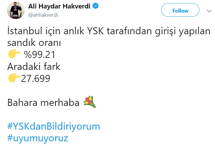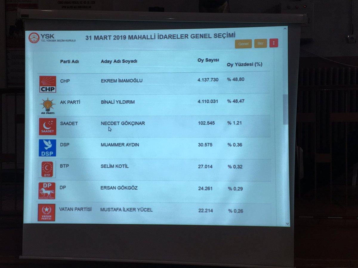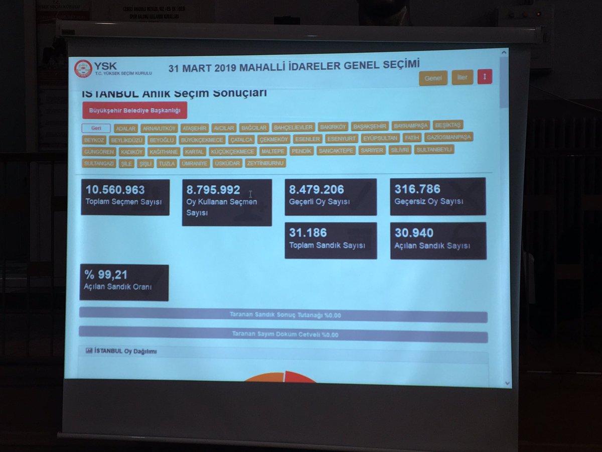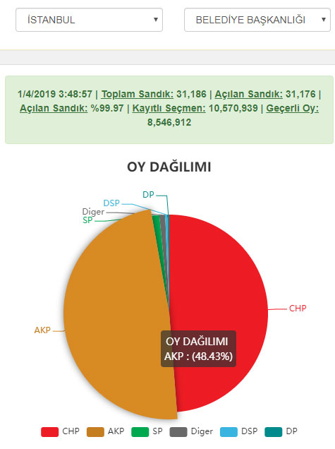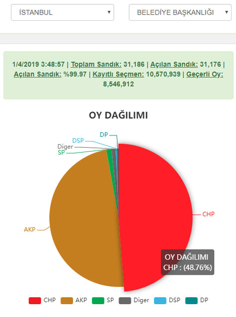 Anadolu Ajansı, CHP adayı Ekrem İmamoğlu öne geçtiği sırada seçim sonuçlarını vermeyi durdurdu. Bunun üzerine CHP, kendi sisteminden, ıslak imza tutanakları ile belirlenen İstanbul Büyükşehir Belediyesi seçim sonucunu açıkladı.