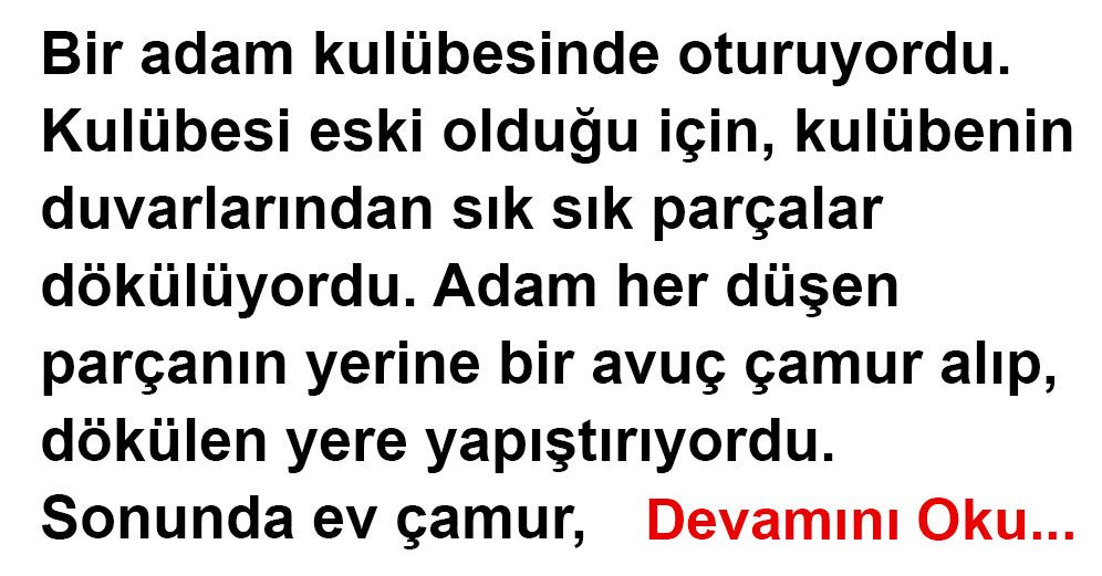 Bir adam kulübesinde oturuyordu. Kulübesi eski olduğu için, kulübenin duvarlarından sık sık parçalar dökülüyordu. Adam her düşen parçanın yerine bir avuç çamur alıp, dökülen yere yapıştırıyordu. Sonunda ev çamur yığını haline geldi ve çöktü.