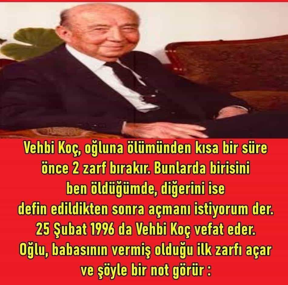 Vehbi Koç, oğlu Rahmi Koç’a ölümünden kısa bir süre önce 2 adet zarf bırakır. Bunlarda birisini ben öldüğümde, diğerini ise defin edildikten sonra açmanı istiyorum der. 25 Şubat 1996 da Vehbi Koç vefat eder. Oğlu, babasının vermiş olduğu ilk zarfı açar ve şöyle bir not görür: “Evladım! Söyle beni çoraplarım ile gömsünler.” sonrasında olanlar ise daha ilginçtir.. Devamı için ilerleyiniz.