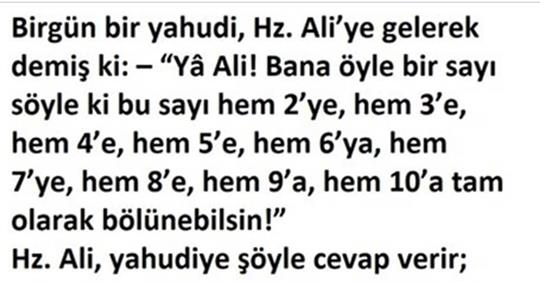 Birgün bir yahudi, Hz. Ali’ye gelerek demiş ki: – “Yâ Ali! Bana öyle bir sayı söyle ki bu sayı hem 2’ye, hem 3’e, hem 4’e, hem 5’e, hem 6’ya, hem 7’ye, hem 8’e, hem 9’a, hem 10’a tam olarak bölünebilsin!”Hz. Ali, yahudiye, “Peki bu suâlini cevaplarsam, müslüman olur musun?” diye sormuş