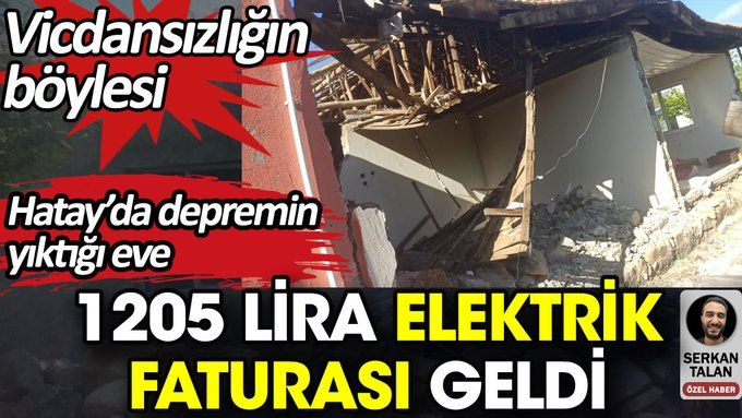 Deprem felaketinde en büyük yıkımın yaşandığı kentlerden Hatay’da ağır hasarlı bir eve elektrik faturası gönderildiği ortaya çıktı. Hatay’ın hassa ilçesinde ağır hasarlı olduğu gerekçesiyle boşaltılan eve 1205 liralık elektrik faturası gönderildi.