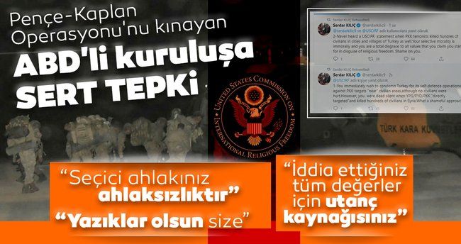 Kılıç ayrıca USCIRF'in Türkiye'deki yüzlerce sivilin terör örgütünce katletmesinde de sessiz kaldığına vurgu yaparak, "Seçici ahlakınız ahlaksızlıktır. Dini özgürlükler adı altında savunduğunuzu iddia ettiğiniz tüm değerler için utanç kaynağısınız. Yazıklar olsun size." ifadelerine yer verdi.