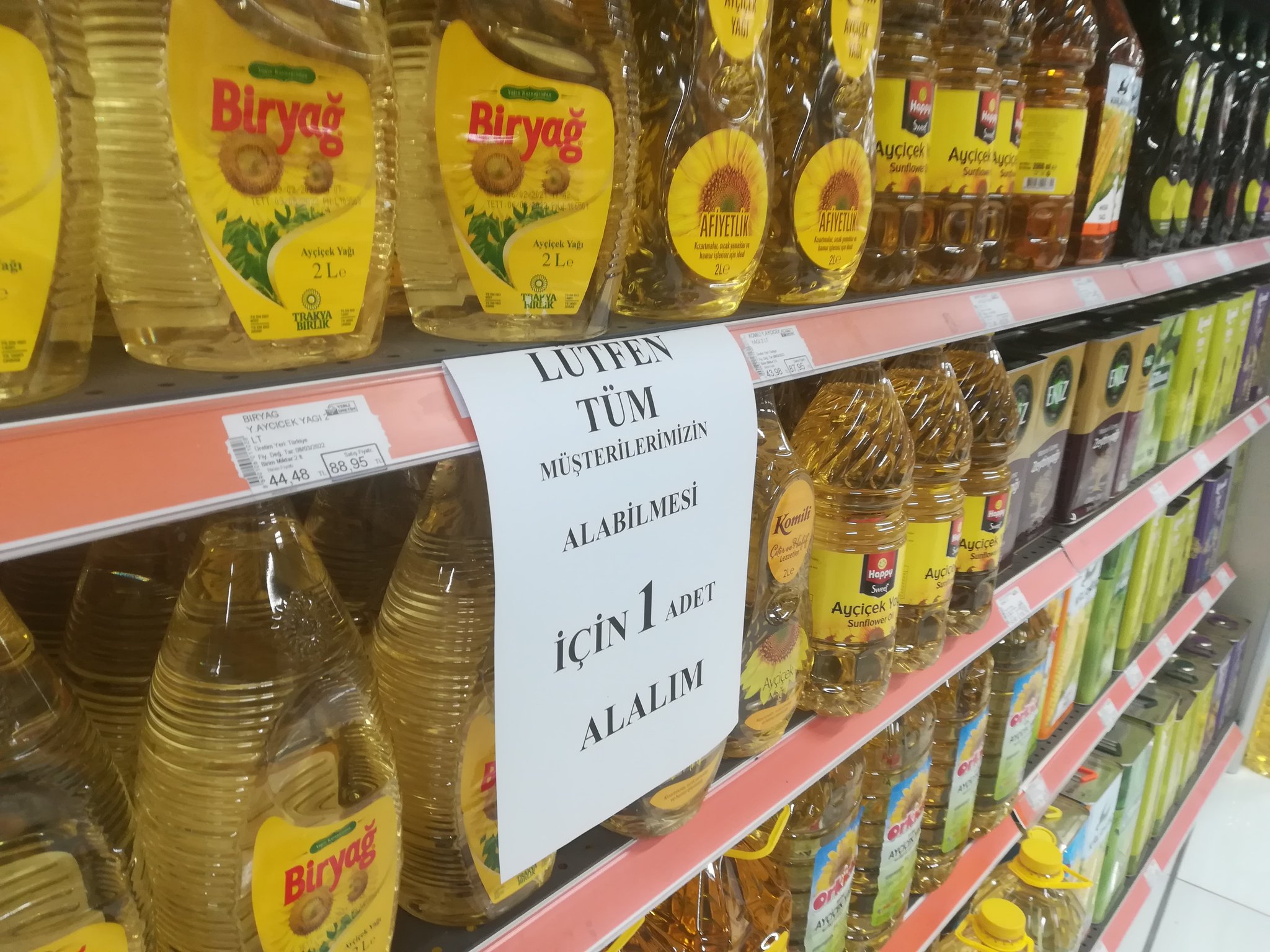 Yağ reyonlarına asılan duyurularda, ''Lütfen tüm müşterilerimizin alabilmesi için 1 adet alalım'' yazıldı: