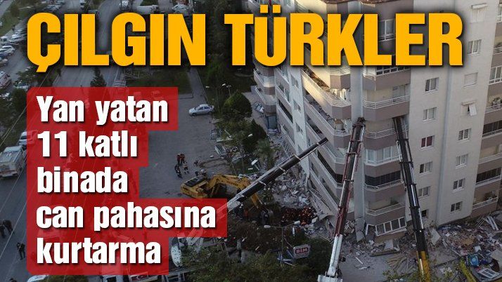 İZMİR’in Seferihisar açıklarında meydana gelen 6.9 büyüklüğündeki depremde, ilk 3 katı çöküp yan yatan 11 katlı binada yapılan arama kurtarma çalışması sırasında vinçlerle destek sağlandı. Binanın yıkılmaması için 3 vinçle destek verildi.
