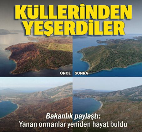 Yangınlardan hemen sonra çekilen fotoğrafların yanına "öncesi", bugünkü yeşil hallerine ise "sonrası" ibaresi eklenerek yapılan paylaşımda ormanlık alanların, doğal gençleştirme ve ağaçlandırma yöntemi ile tekrar yeşillendiği görüldü.
