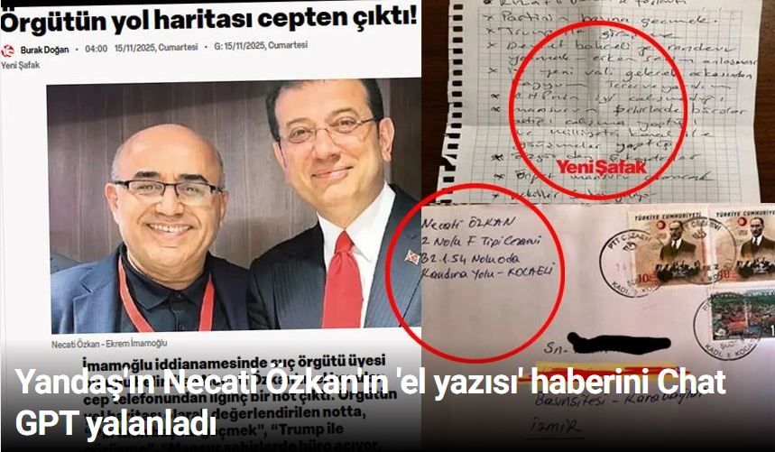 Yapay Zeka Chat GPT'ye, yandaş Yeni Şafak'taki haberde gösterilen el yazısı ile Necati Özkan'ın Kandıra Cezaevi'nden gönderdiği mektup zarfındaki el yazısını analiz etmesini istedik. Ve yapay zeka şöyle bir sonuç çıkardı: "İki el yazısı aynı kişiye aitmiş gibi görünmüyor. Harf şekilleri, eğim, hız, baskı ve bütünsel stil arasında belirgin ve sistematik farklar var."