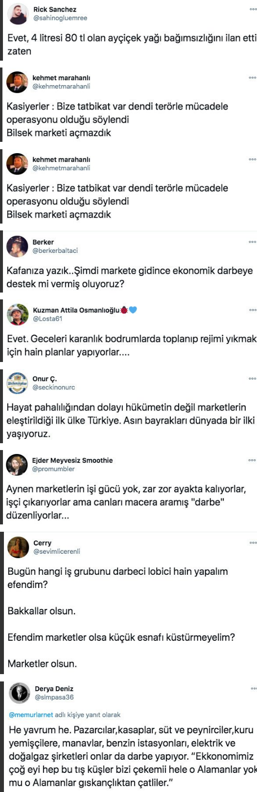Marketlerin darbeci ilan edildiğini gören kimileri dalga geçerek kimileri de eleştirerek bazı yorumlar yaptı. İşte sosyal medyanın gündemine oturan 'Market darbesi' yorumları.