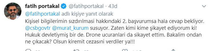 FOX TV Ana Haber Sunucusu Fatih Portakl'ın İzmir'deki çiftlik evinin görüntüleri, yandaş medya ve sosyal medyada yayılmıştı. Evinin fotoğraflarının, drone ile gizli bir şekilde çekildiğini belirten Portakal, söz konusu görüntülerle ilgili Cumhurbaşkanlığı İletişim Merkezi'ne başvurduğunu aktarmıştı.