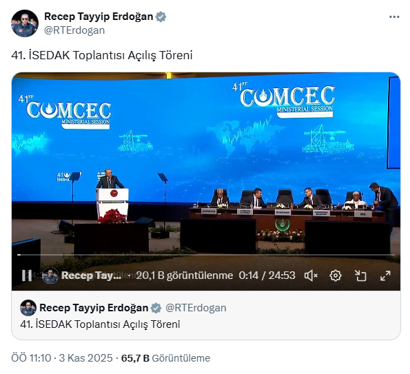 Bugün ayrıca Cumhurbaşkanı Erdoğan'ın resmi X hesabından, 41. İSEDAK Toplantısı Açılış Töreni'nin canlı yayını paylaşıldı. 11.10'da yapılan paylaşım 13.00 itibariyle 65,7 bin görüntüleme aldı.