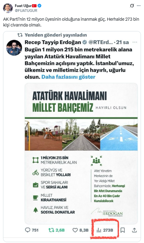 Erdoğan’ın 21,2 milyon takipçisi bulunan X hesabındaki "Atatürk Havalimanı Millet Bahçesi" paylaşımı, şu sıralarda 353 bin görüntülemeye erişti.