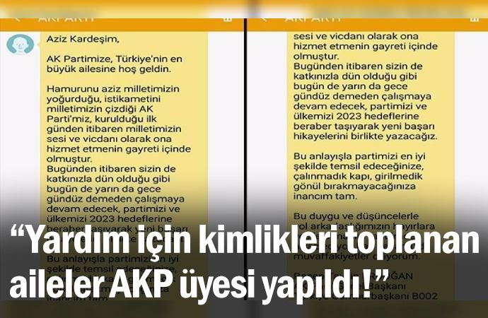 Şırnak ve köylerinde maddi durumu iyi olmayan aileleri tespit ederek, ‘yardım’ adı altında ziyaret eden AKP’liler, yurttaşları bilgisi dışında AKP’ye üyesi yaptığı belirtildi. Aile bireylerinin nüfus cüzdanlarını alan AKP’liler, bireylerin kimlik bilgilerinin yanı sıra telefon numaralarını aldıktan bir süre sonra, “AK Partimize, Türkiye’nin en büyük ailesine hoş geldin” mesajı gönderdi. AKP’ye bu şekilde üye yapıldıklarını öğrenen yurttaşlar, yaşadıkları şaşkınlığın ardından AKP’li yetkilileri arayarak, üyeliklerinin iptal edilmesini talep etti.