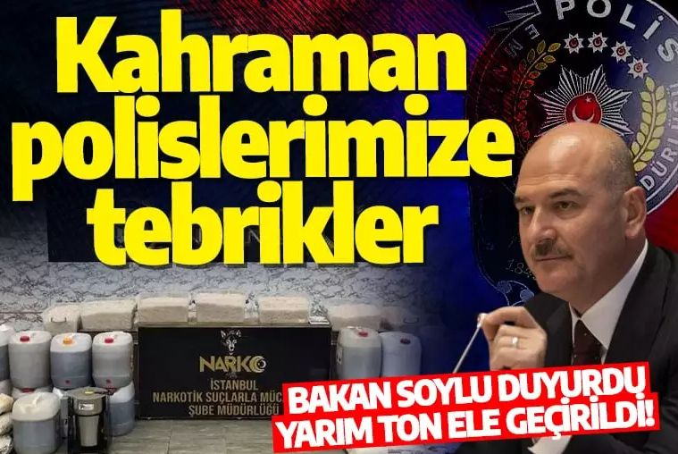 Bakan Soylu, İstanbul İl Emniyet Müdürlüğü Narkotik Suçlarla Mücadele Şube Müdürlüğü ekiplerince Beylikdüzü'nde yapılan operasyonda toplam 500 kilo 750 gram metamfetamin ve 169 kilo kimyasal katkı maddesi ele geçirildiğini duyurarak, "İstanbul İl Emniyet Müdürlüğümüze ve kahraman polislerimize tebrikler" ifadelerini kullandı.