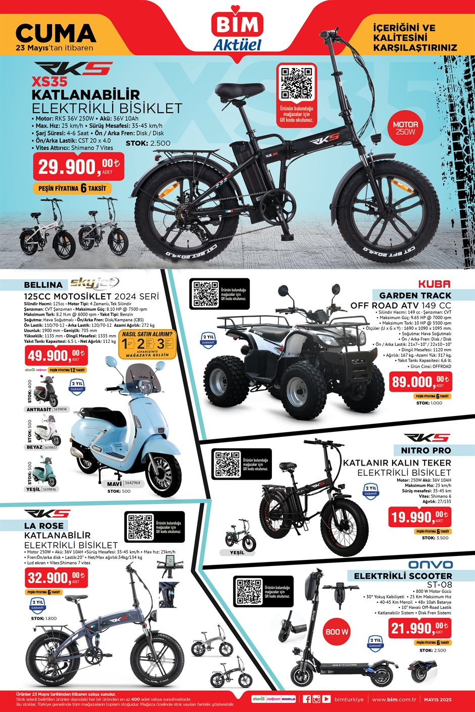 Bim aktüel ürünler 23 Mayıs 2025 yayımlandı. Alışveriş tutkunları bim'de bu hafta indirim araştırmalarına hız kazandırdı. Bahar aylarında alışveriş hazırlıkları yapan milyonlarca kişi bim aktüel katalog ürünlerine odaklandı. Bim aktüel 23 Mayıs 2025 kataloğu içerisinde; RKS XS35 Katlanabilir Elektrikli Bisiklet 29.900 TL, Bellina 2024 Seri 125CC Motosiklet 49.900 TL, KUBA Garden Track Off Road Atv 89.000 TL, RKS Nitro Pro Kalanaır Kalın Teker Elektrikli Bisiklet 19.990 TL, RKS La Rose Katlanabilir Elektrikli Bisiklet 32.900 TL, Onvo ST-08 Elektrikli Scooter 21.990 TL'den satışa sunulacak. Bim'in ürünleri aynı zamanda bim.com.tr online alışveriş adresinden de görüntülenebilecek. Bim'de bu hafta neler var merak ediliyor. İşte, bim aktüel ürünler 23 Mayıs 2025 kataloğu tamamı...