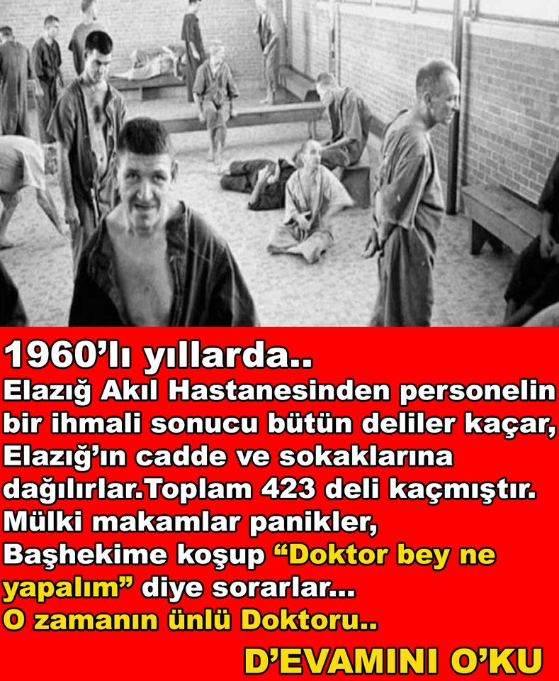 1960’lı senelerde Elazığ Akıl Hastanesinden personelin bir ihmali neticesi bütün deliler kaçar, Elazığ’ın cadde ve sokaklarına dağılırlar. Toplam 423 deli kaçmıştır. Mülki makamlar panikler, Başhekime koşup “doktor bey ne yapalım” diye sorarlar