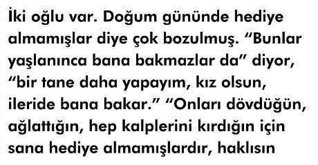 İki oğlu var. Doğum gününde hediye almamışlar diye çok bozulmuş. “Bunlar yaşlanınca bana bakmazlar da” diyor, “bir tane daha yapayım, kız olsun, ileride bana bakar.” “Onları dövdüğün, ağlattığın, hep kalplerini kırdığın için sana hediye almamışlardır, haklısın yaşlanınca sana bakmazlar. Ama kızın olsa senin gibi anneye o da bakmaz, haksız da sayılmaz” diyemiyorsun.